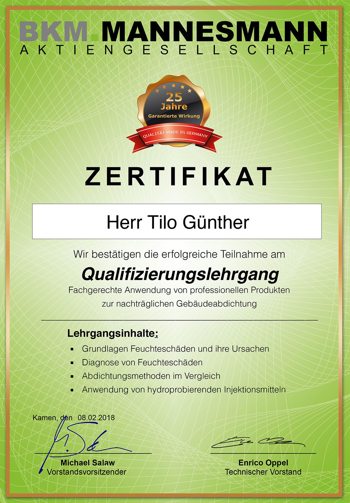 Alle unsere Produkte werden nach strengsten Qualitätsstandards gefertigt und kontinuierlich auf gleichbleibende Güte und Wirksamkeit geprüft. Um diese hohen Standards zu sichern, hat die BKM.MANNESMANN AG als Hersteller eigene, europaweit gültige Prüfkriterien entwickelt. So können Sie sich jederzeit darauf verlassen, nur Produkte in bester Qualität zu erhalten – für maximale Sicherheit, Langlebigkeit und nachhaltigen Erfolg Ihrer Mauertrockenlegung.